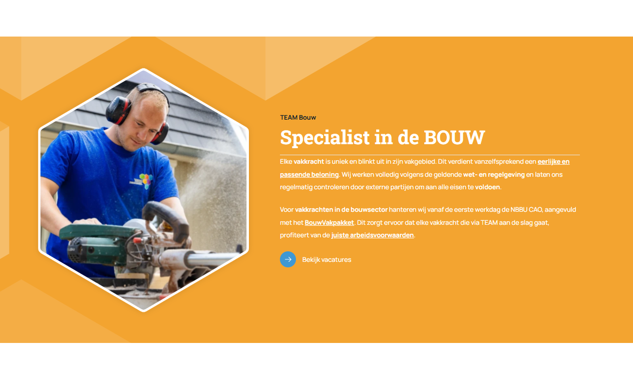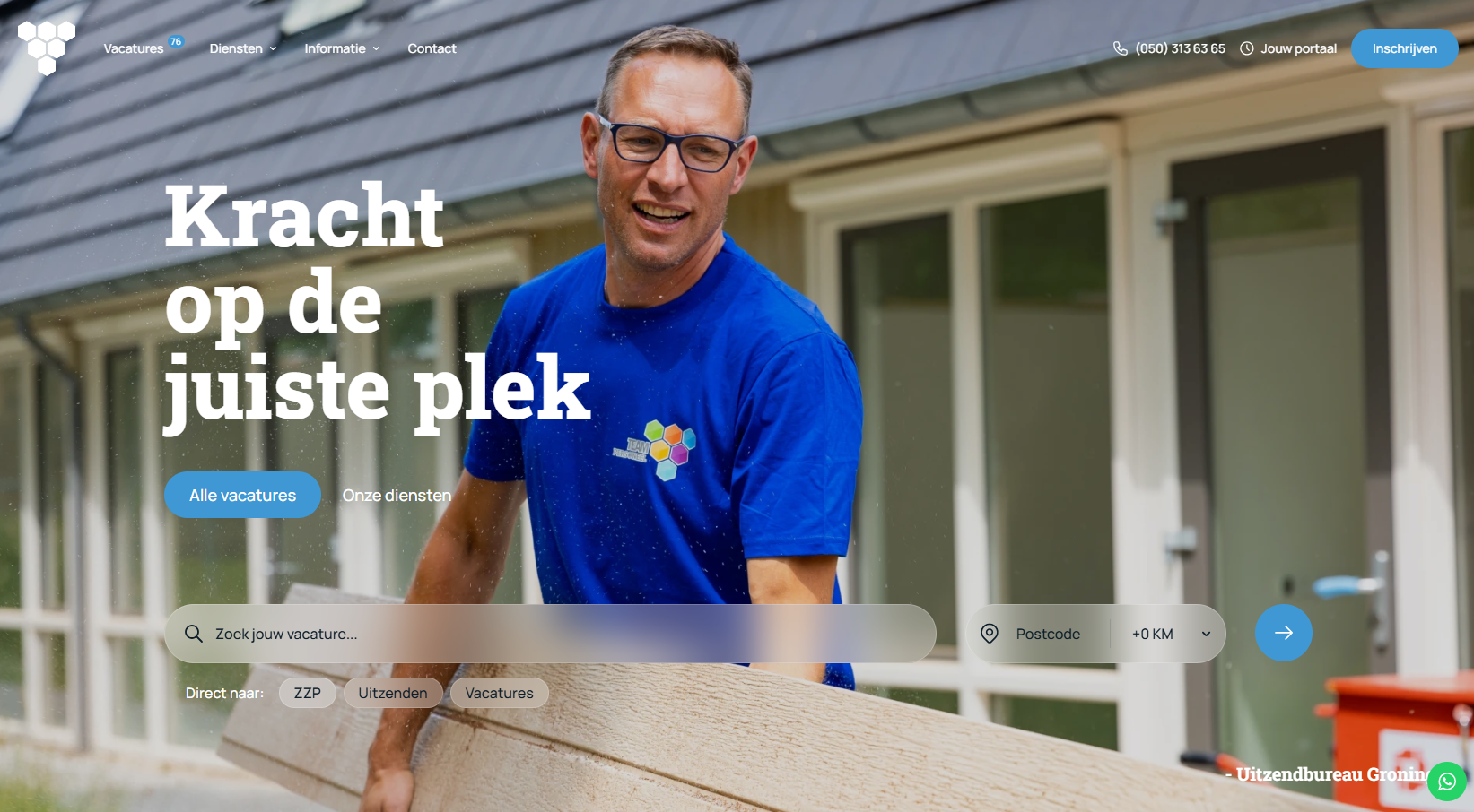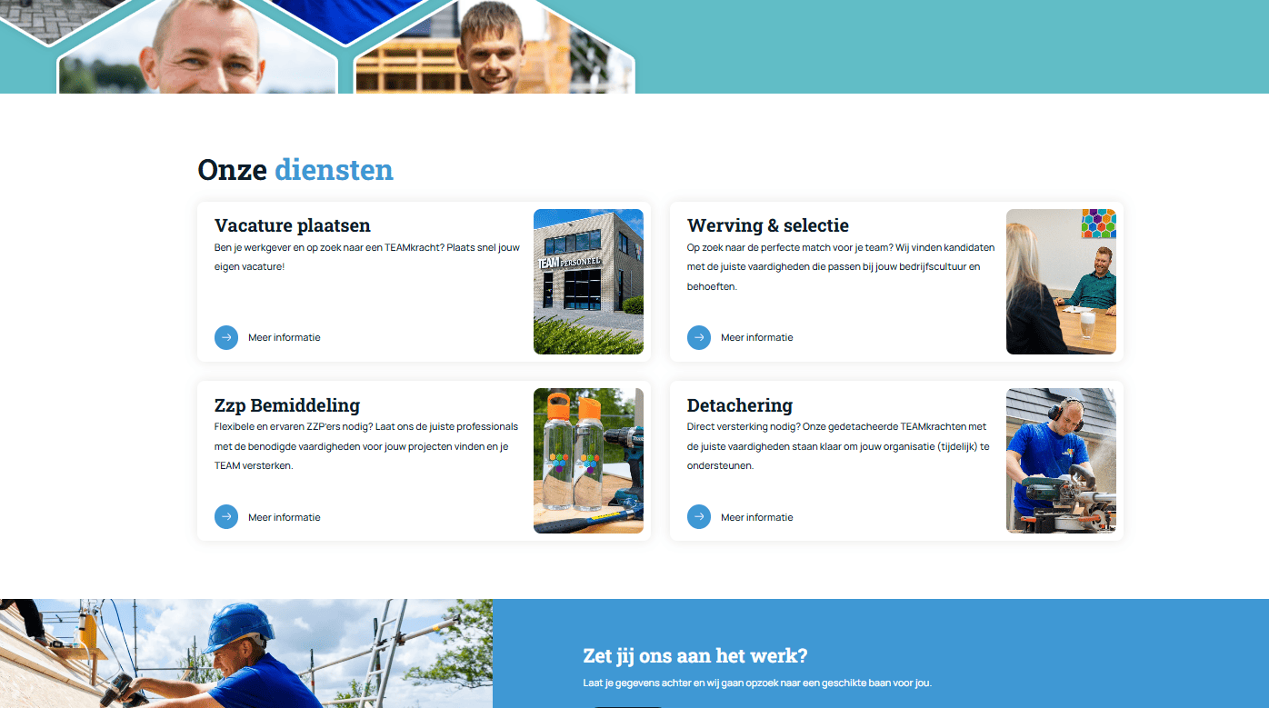 Voor TEAM personeel bouwden we een krachtige, overzichtelijke uitzendbureau website waar kandidaten eenvoudig kunnen filteren, zoeken en solliciteren. De website sluit volledig aan op hun doelgroep in de bouw en techniek en wordt automatisch gevuld met nieuwe vacatures via onze ATS Uitzendplaats. Het resultaat: een professionele uitstraling, hogere conversie en veel betere online vindbaarheid binnen hun niche.