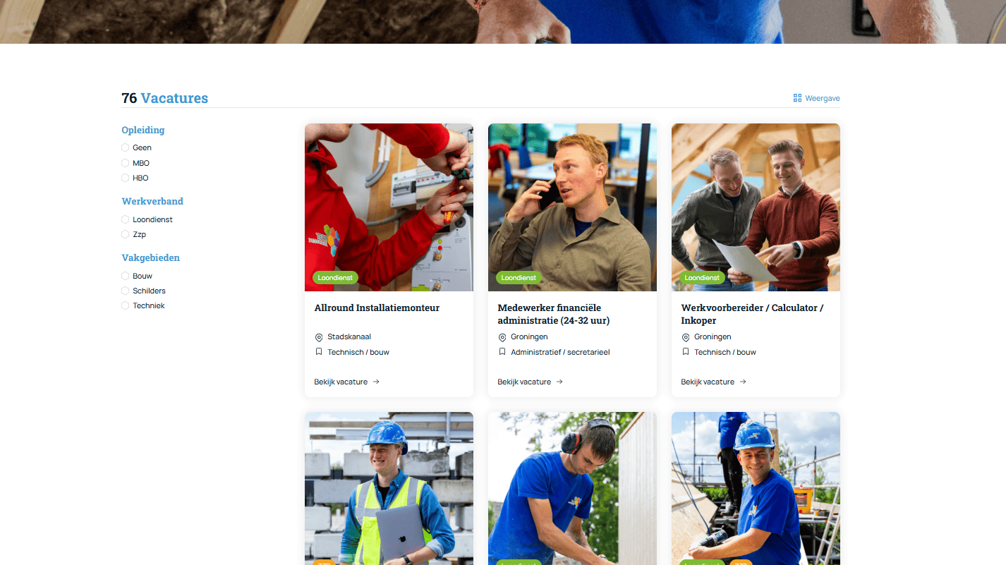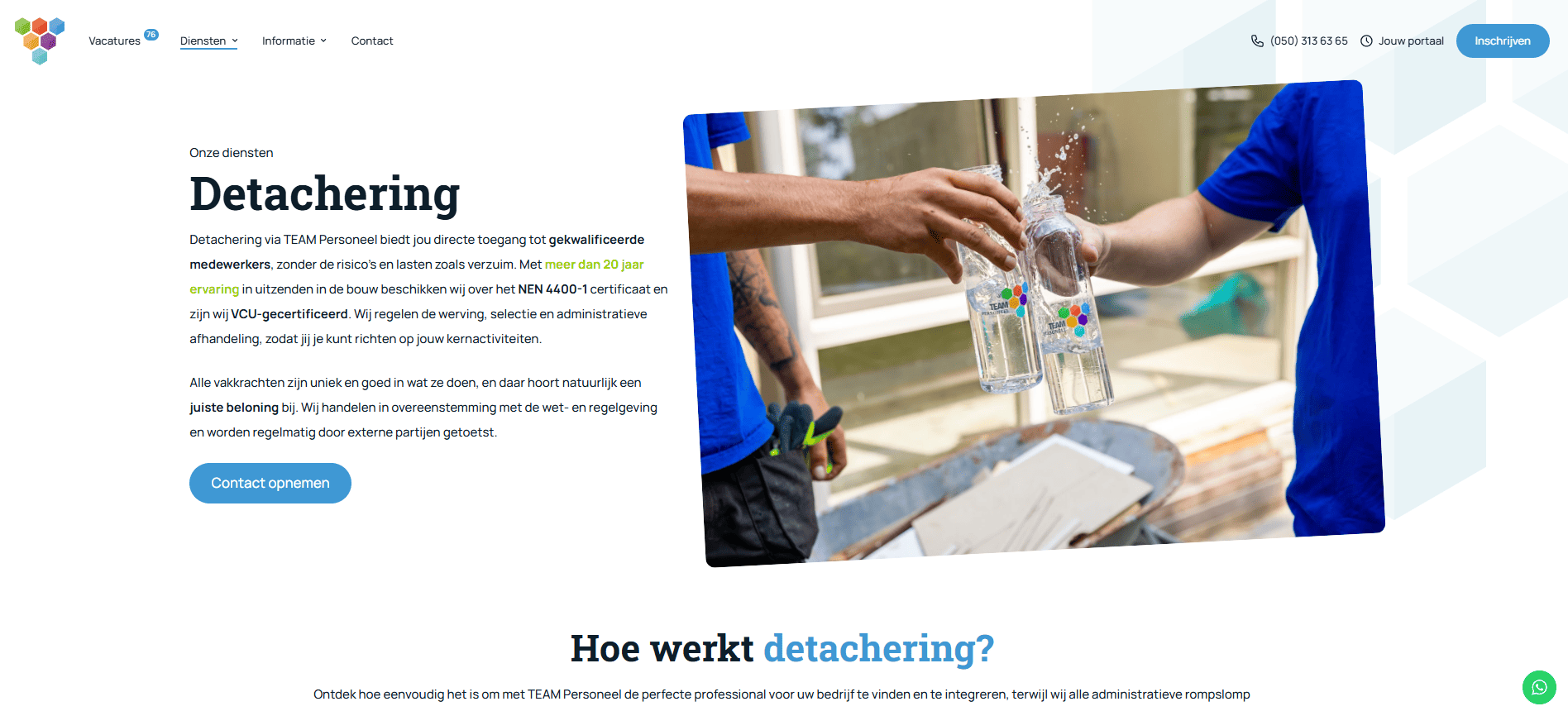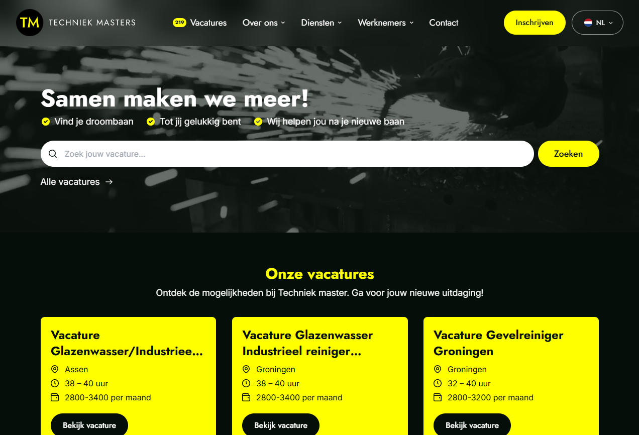 Voor TEAM personeel bouwden we een krachtige, overzichtelijke uitzendbureau website waar kandidaten eenvoudig kunnen filteren, zoeken en solliciteren. De website sluit volledig aan op hun doelgroep in de bouw en techniek en wordt automatisch gevuld met nieuwe vacatures via onze ATS Uitzendplaats. Het resultaat: een professionele uitstraling, hogere conversie en veel betere online vindbaarheid binnen hun niche.